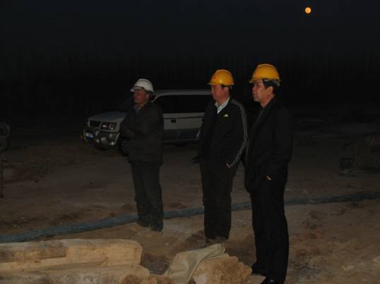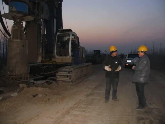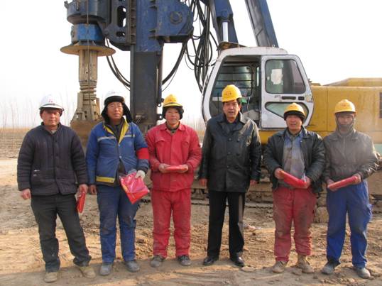 19日一大早,由韋永智隊(duì)長(zhǎng)帶隊(duì),副隊(duì)長(zhǎng)安林、張巍、黨群工作部與基礎(chǔ)工程處經(jīng)理南峰等一行驅(qū)車趕往目的地。一路上經(jīng)太原、過石家莊,途經(jīng)大小市、縣十余個(gè),也無一時(shí)停歇。下午6時(shí)左右,終于到達(dá)了由隊(duì)基礎(chǔ)工程處承擔(dān)的“天津—保定高速鐵路線米寧莊特大橋項(xiàng)目”樁基施工地。韋隊(duì)長(zhǎng)向所有職工表示親切慰問,并向該項(xiàng)目2010年度四位優(yōu)秀職工現(xiàn)場(chǎng)頒發(fā)了獎(jiǎng)金和證書,安林、張巍副隊(duì)長(zhǎng)了解了項(xiàng)目生產(chǎn)、生活情況。直到天色已晚,幾位領(lǐng)導(dǎo)在視察完XZ-20旋挖機(jī)現(xiàn)場(chǎng)施工后,才離開了工地。