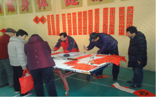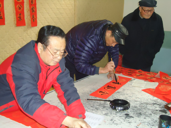 1月18日,書法協(xié)會的同志們在繼韓馬基地“春節(jié)送春聯(lián)送祝!被顒又螅陉牪侩x退休活動室為職工家屬寫春聯(lián)送祝福。活動現(xiàn)場來了許多職工家屬,書法家們揮毫潑墨,有行書、楷書、隸書和篆書,風格迥異,內(nèi)容有社會和諧、美好愿望、中國夢以及父母望子成龍等。一幅幅飽含真情的春聯(lián)被大家捧在手里,一句句祝福躍然紙上,一張張笑臉伴隨筆墨飛揚,整個活動室充滿濃濃的年味兒。書法家們熱情高漲,將一幅又一幅春聯(lián)送到大家手中,直到下午時分,墨盡紙光,大家仍意猶未盡。