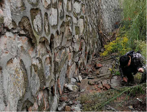 滑坡體前緣擋土墻向前推移近cm,并出現(xiàn)膨脹掉塊