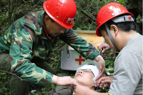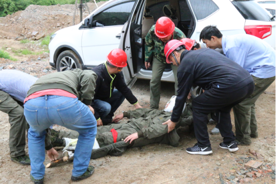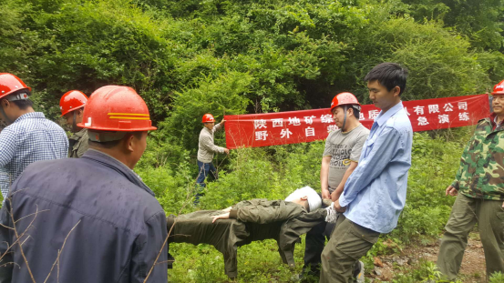 中午12點25分演練活動正式開始,野外地質(zhì)調(diào)查項目組一行3人上山采樣,下山途中一人腳下踩空滾下山坡,被樹木擋住,造成腿骨骨折、頭部擦傷、多處軟組織挫傷。事故發(fā)生后同組人員一邊利用現(xiàn)場急救物品向傷者施救,一邊向項目組組長匯報事發(fā)情況,請求支援。項目組長將情況馬上匯報給公司安全管理與保衛(wèi)部,同時立即組織人員帶著醫(yī)藥箱、斧頭、繩子等應(yīng)急物品開車迅速趕往事發(fā)現(xiàn)場。救援人員到達現(xiàn)場后按照劇情分工,迅速進入角色,各負其責,有人現(xiàn)場砍樹,有人制作簡易擔架、有人熟練進行骨折處理和包扎,很快將傷員抬到山下自備車中。