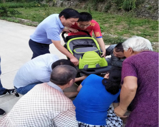 只見(jiàn)嬰兒脖子卡在嬰兒車右側(cè)圍擋縫隙內(nèi)動(dòng)彈不得,嬰兒哭聲凄慘,臉色已發(fā)青。情況極其危急,如不及時(shí)救助,將危及到孩子年幼的生命。孩子母親在場(chǎng)聲嘶力竭地?zé)o助哭喊聲更糾結(jié)著人們的心。大家一邊安慰孩子母親的焦急情緒,一邊從村子里借來(lái)鉗子等輔助工具,將嬰兒車護(hù)欄螺絲取下,并合力掰開(kāi)卡在嬰兒脖子處的護(hù)欄,經(jīng)過(guò)十多分鐘的緊張救助,被困嬰兒最終平安獲救。獲救嬰兒的母親抱著孩子癱坐在路邊,滿含感激的淚水說(shuō)不出話來(lái)。大家把母子扶到路邊后,又乘上車,在落日的余暉下繼續(xù)趕路……